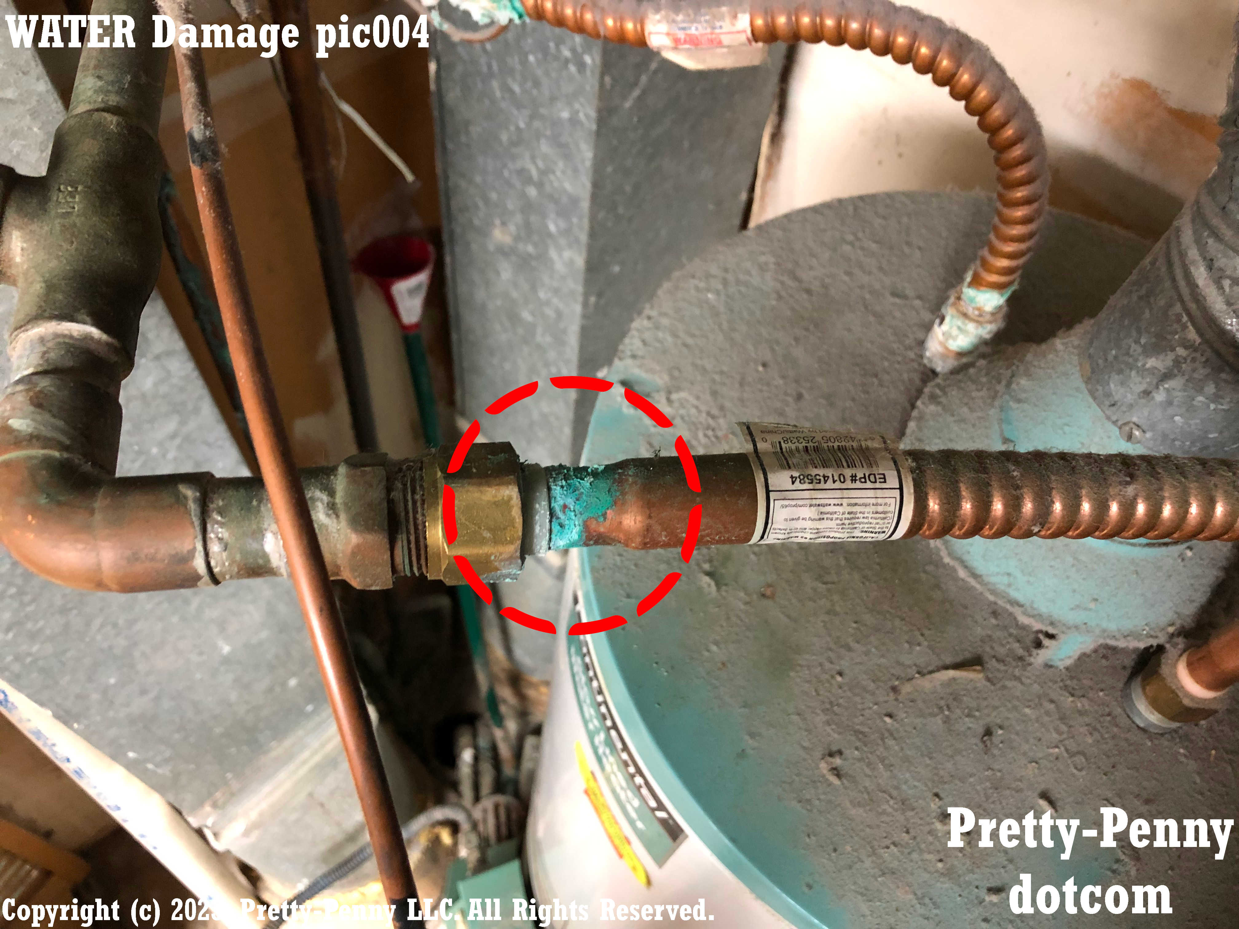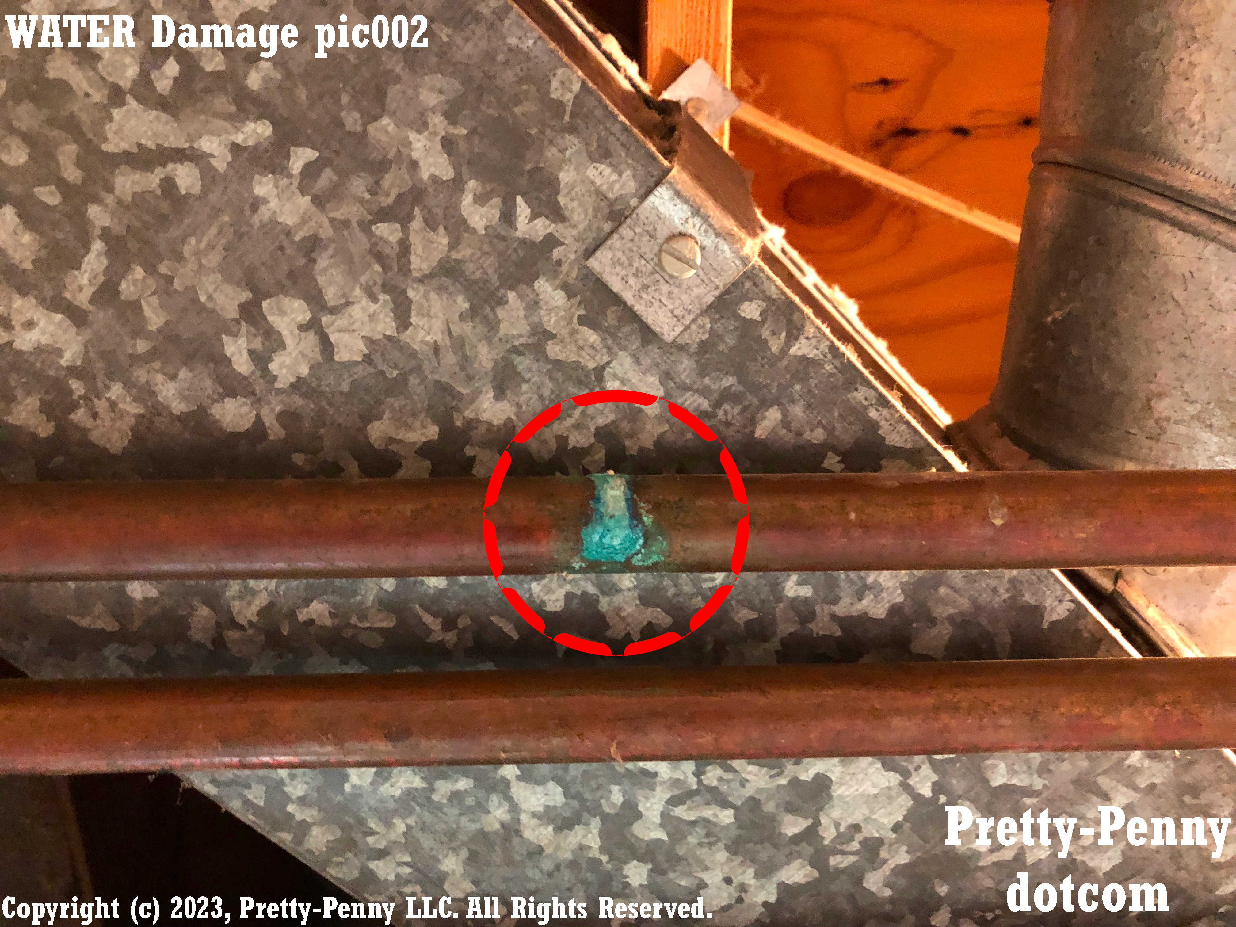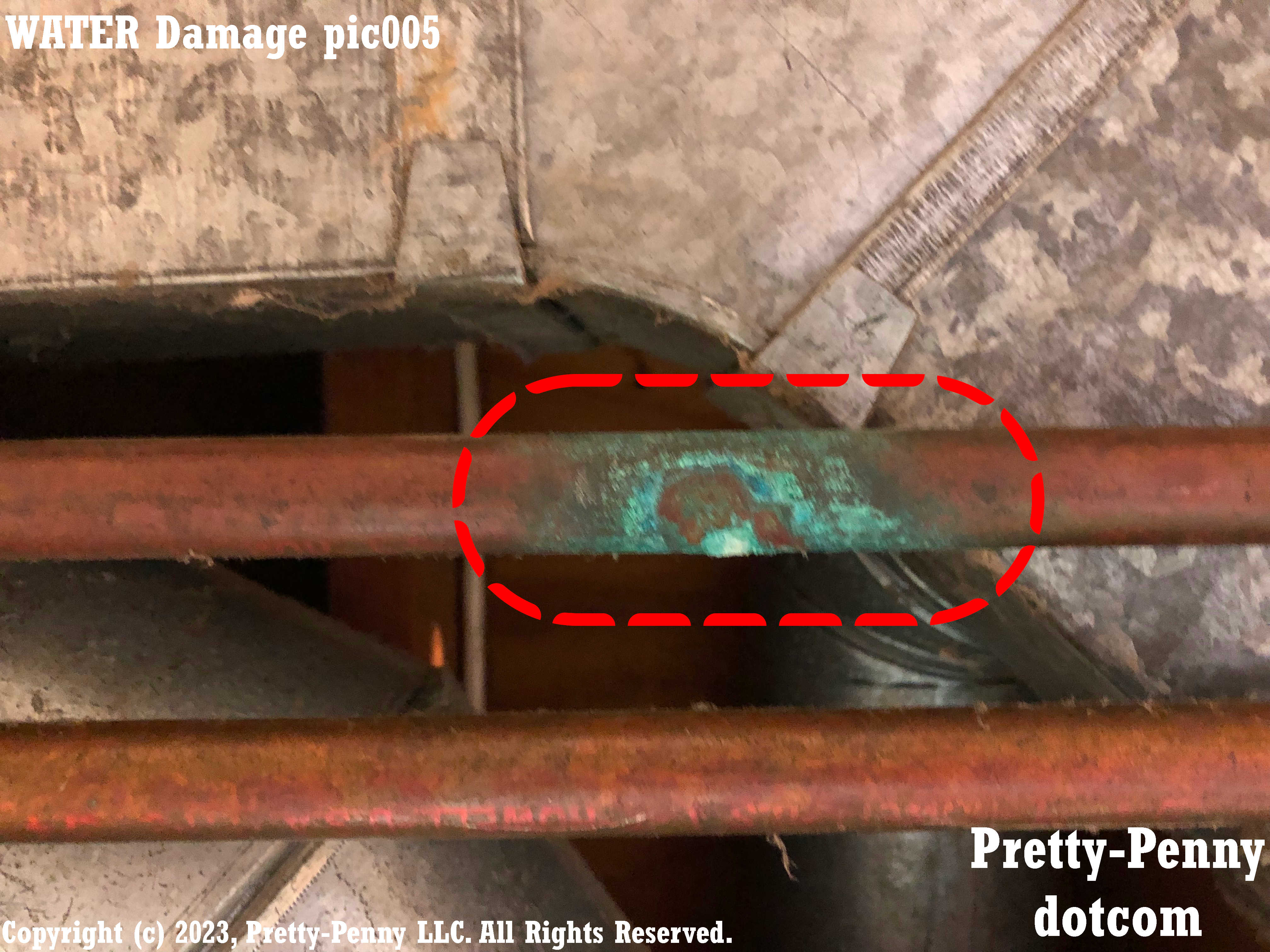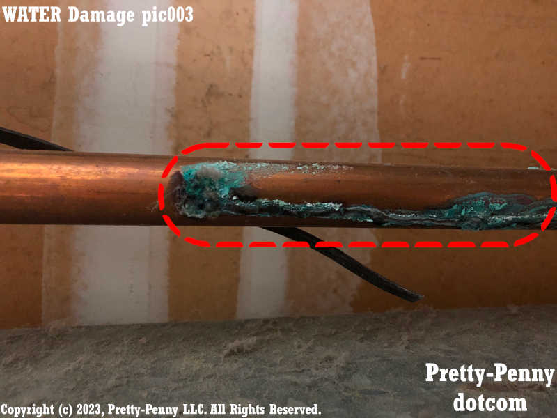 Example of water damage to copper pipe from pinhole leak that has dripped.